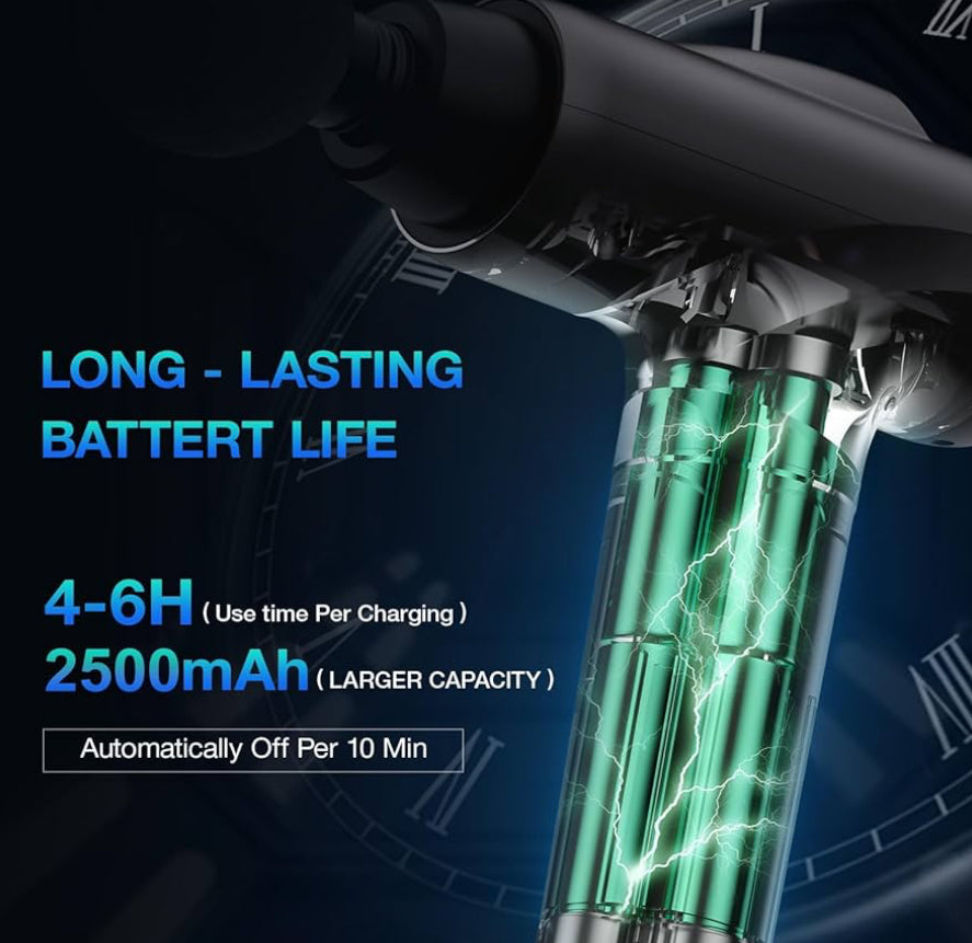 🔋(Rechargeable Battery & Smart LED Display): Powered by a rechargeable battery, our deep muscle massager gun runs for several hours straight. The built-in display shows off speed and battery percentage, so you always know when to charge.